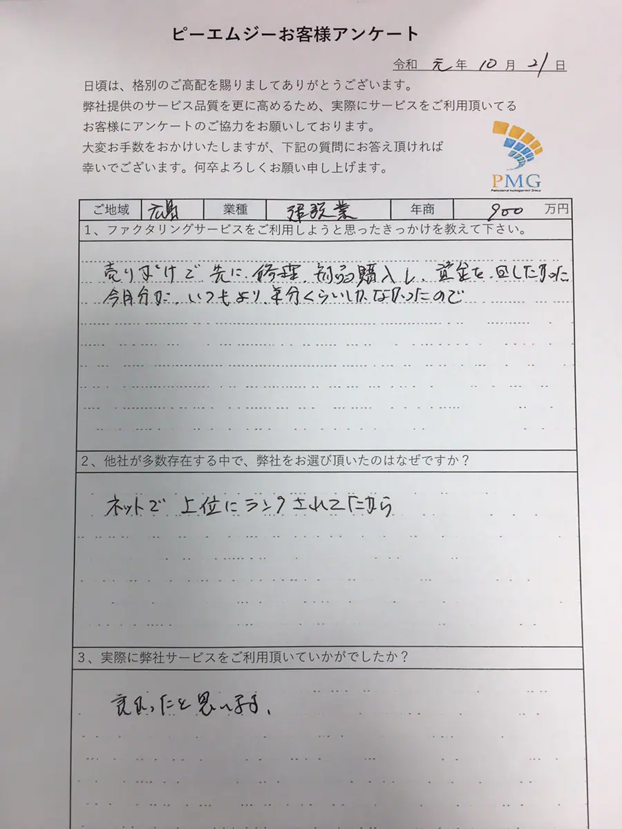 トップページ お客様からのアンケート 広島県のお客様からのファクタリングに関するアンケート 事例を絞り込む 業種で絞る 広告業 建設業 運送業 製造業 IT サービス業 卸売業 地域で絞る 北海道 岩手県 宮城県 秋田県 山形県 福島県 茨城県 栃木県 群馬県 埼玉県 千葉県 東京都 神奈川県 山梨県 新潟県 富山県 静岡県 愛知県 広島県 山口県 福岡県 熊本県 大分県 沖縄県 年で絞る 2025年 2024年 2023年 2022年 2021年 2020年 2019年 2018年 すべてリセットこの条件で絞り込む 【広島県】建設業のお客様 建設業広島県 2019.12.03 【広島県】清掃業 サービス業広島県 2019.12.02