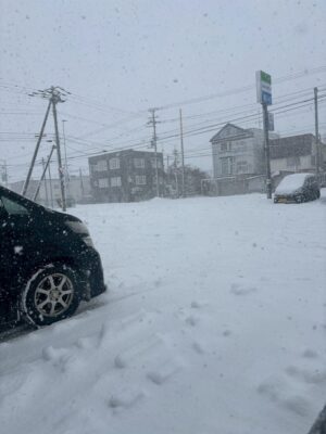 ところが現地では、朝から大雪。視界が白く霞むほどで、道路も車も一面の雪景色に包まれていました。