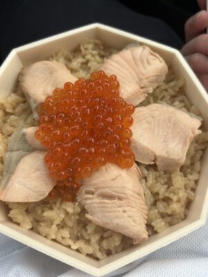 「はらこ飯」という、炊き込みご飯の一種で、醤油や味醂などで鮭を煮込んだ煮汁を使って炊いたご飯の上に、鮭の身といくらを贅沢に乗せた郷土料理です。