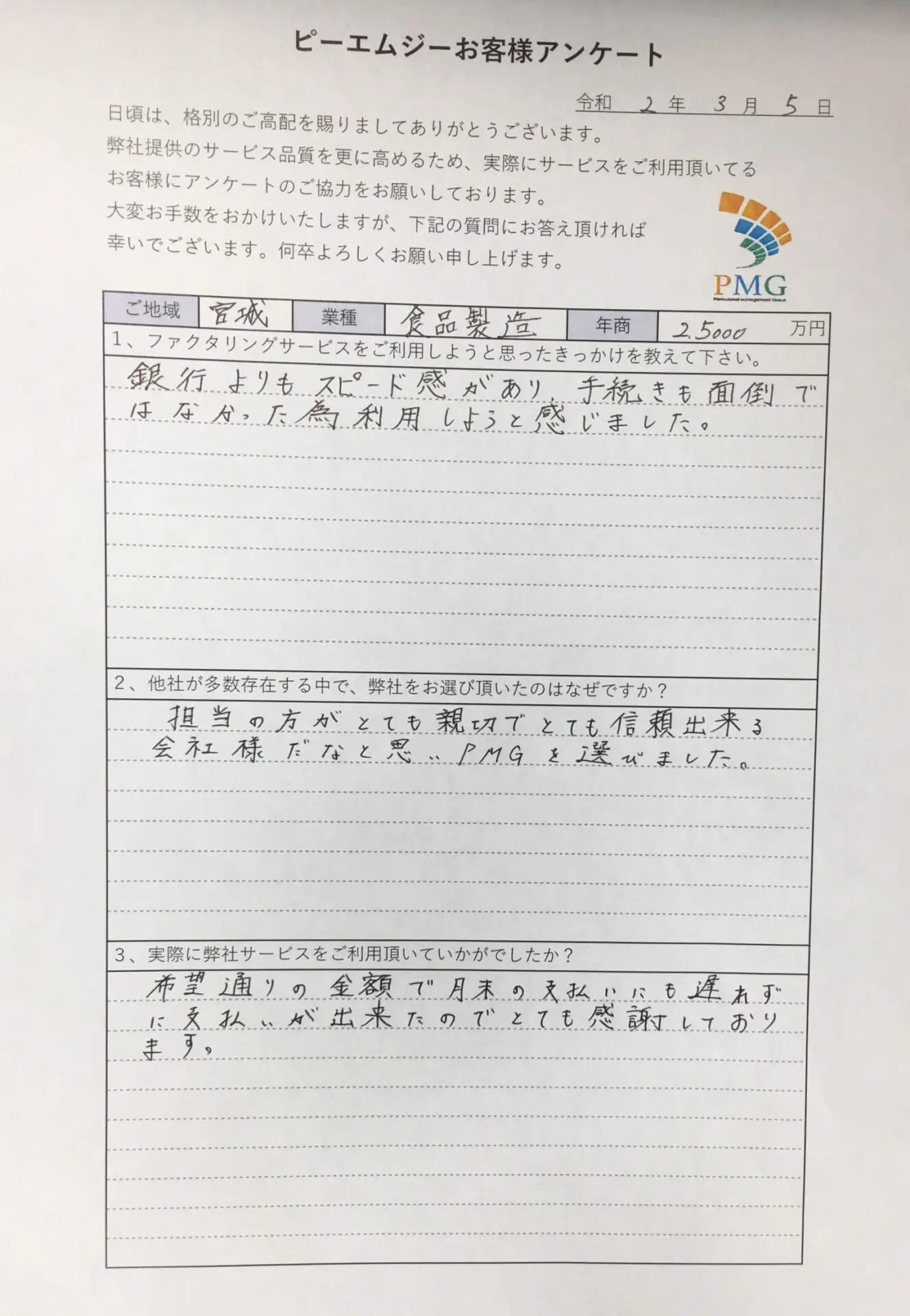トップページ お客様からのアンケート 宮城県のお客様からのファクタリングに関するアンケート 事例を絞り込む 業種で絞る 広告業 建設業 運送業 製造業 IT サービス業 卸売業 地域で絞る 北海道 岩手県 宮城県 秋田県 山形県 福島県 茨城県 栃木県 群馬県 埼玉県 千葉県 東京都 神奈川県 山梨県 新潟県 富山県 静岡県 愛知県 広島県 山口県 福岡県 熊本県 大分県 沖縄県 年で絞る 2025年 2024年 2023年 2022年 2021年 2020年 2019年 2018年 すべてリセットこの条件で絞り込む 【宮城県】土木業のお客様 建設業宮城県 2020.08.12 【宮城県】食品製造業のお客様 製造業宮城県 2020.03.05