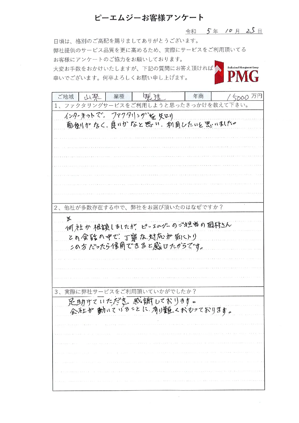 トップページ お客様からのアンケート 山梨県のお客様からのファクタリングに関するアンケート 事例を絞り込む 業種で絞る 広告業 建設業 運送業 製造業 IT サービス業 卸売業 地域で絞る 北海道 岩手県 宮城県 秋田県 山形県 福島県 茨城県 栃木県 群馬県 埼玉県 千葉県 東京都 神奈川県 山梨県 新潟県 富山県 静岡県 愛知県 広島県 山口県 福岡県 熊本県 大分県 沖縄県 年で絞る 2025年 2024年 2023年 2022年 2021年 2020年 2019年 2018年 すべてリセットこの条件で絞り込む 【山梨県】製造業 ファクタリングを利用したお客様の声 製造業山梨県 2023.10.25