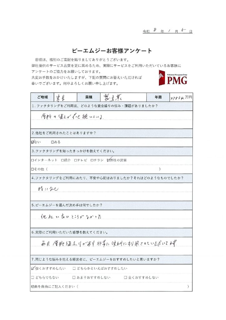 【東京都】製造業 ファクタリングを利用したお客様の声