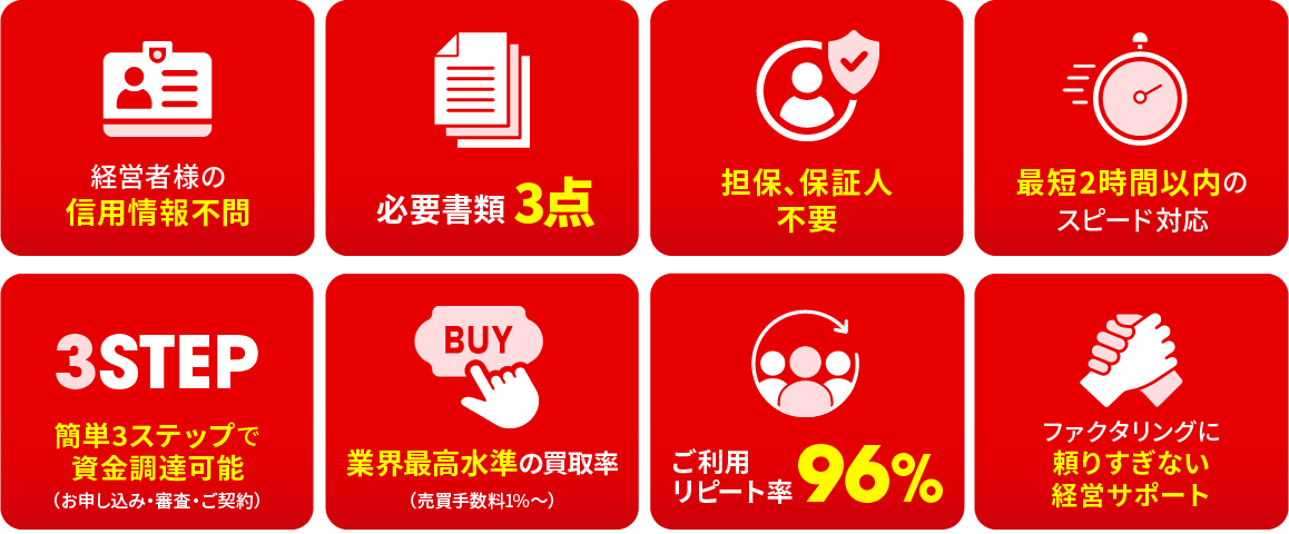 償還請求権の無い(ノンリコース型)売買取引となりますので、お客様に返済の義務はございません。また保証人・小切手・手形などの担保も一切いただきません。