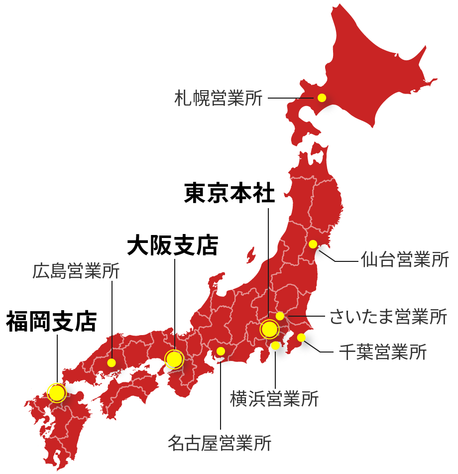 東京を起点に北は北海道から南は九州まで支店を構え、日本全国のお客様の元に担当者が駆け付け、ファクタリング(売掛金早期資金化サービス)をご提供しています。最短即日入金のスピード対応で一社でも多くの企業の資金繰りの悩みを解消し、二人三脚で未来を創る真のパートナーを目指しています。