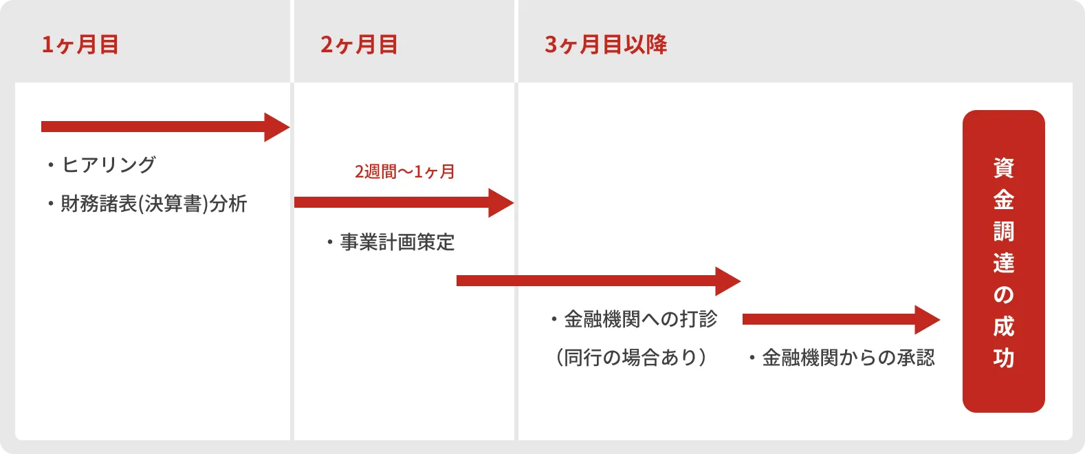 また、銀行融資の返済が財務状態を圧迫している場合は、融資組替えや返済猶予の調整などの交渉にも対応。経営状態が安定するまで、きめ細やかに伴走します。
